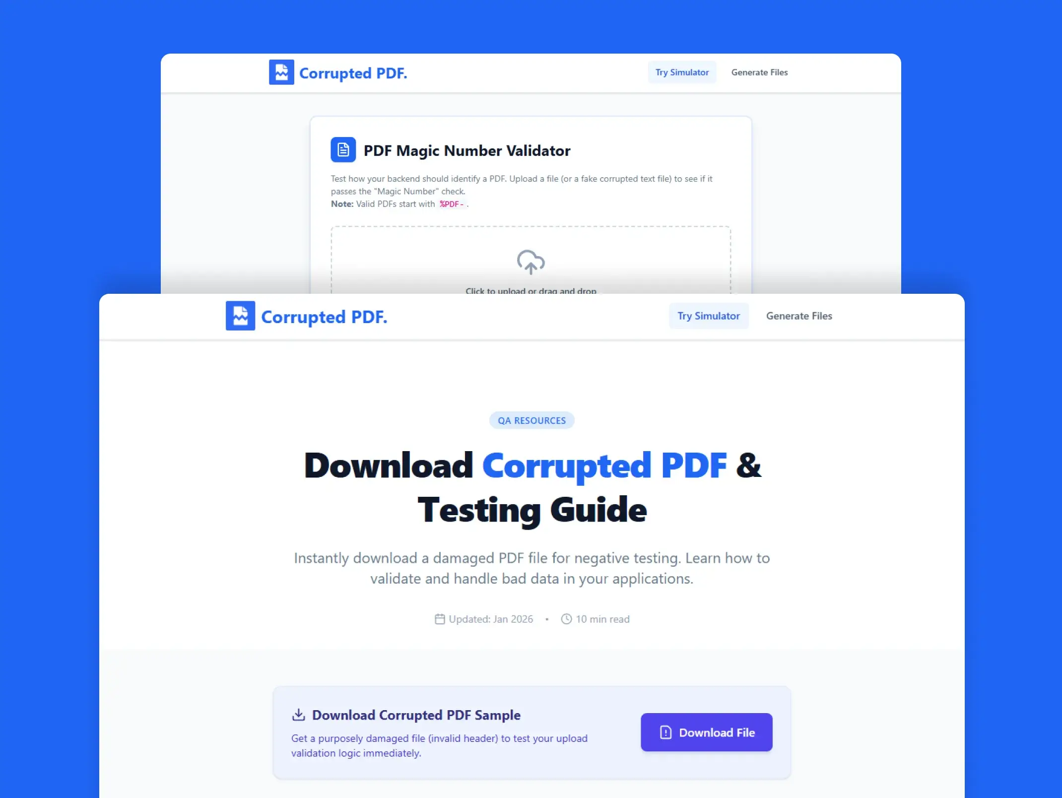 Download broken and malformed PDFs to test your file upload systems. The easiest way to stress-test your app's validation logic.
